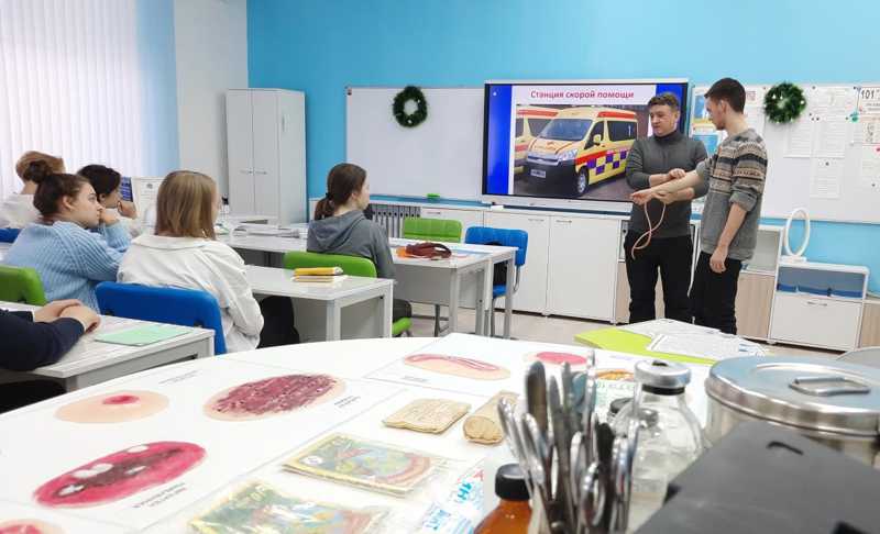В рамках акции «Семейный день профориентации» с профессией фельдшера учащихся знакомил папа учащегося медицинского профиля, фельдшер станции скорой медицинской помощи города – Пьянзин Владимир Васильевич.