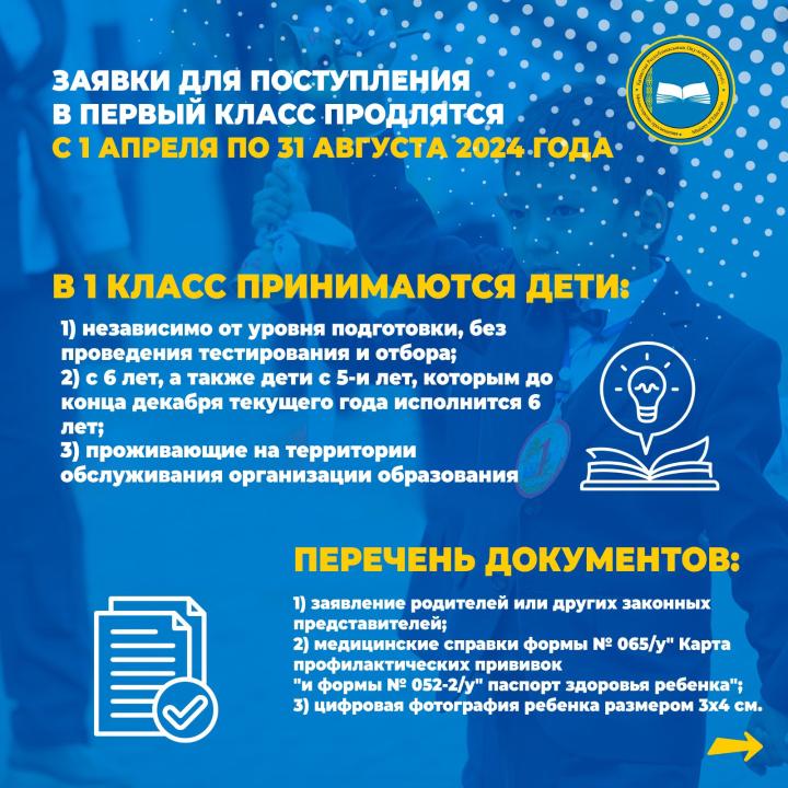 С 1 апреля по 31 августа 2024 года принимаются заявки для поступления в первый класс. Родители могут подать документы своих детей на веб-портале электронного правительства egov.kz. При этом в лицеи и гимназии дети пойдут без экзаменов, передает пресс-служба Министерства просвещения РК.