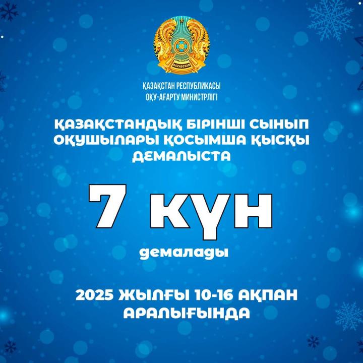 1-сыныпта білім алушыларға 2025 жылғы 10-16 ақпан аралығында (күнтізбелік 7 күн) қосымша демалыс беріледі.