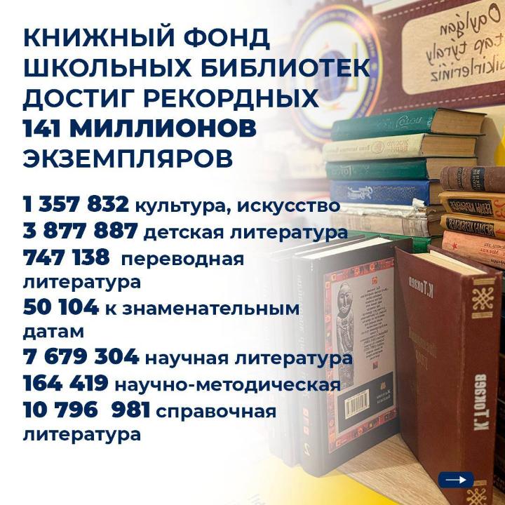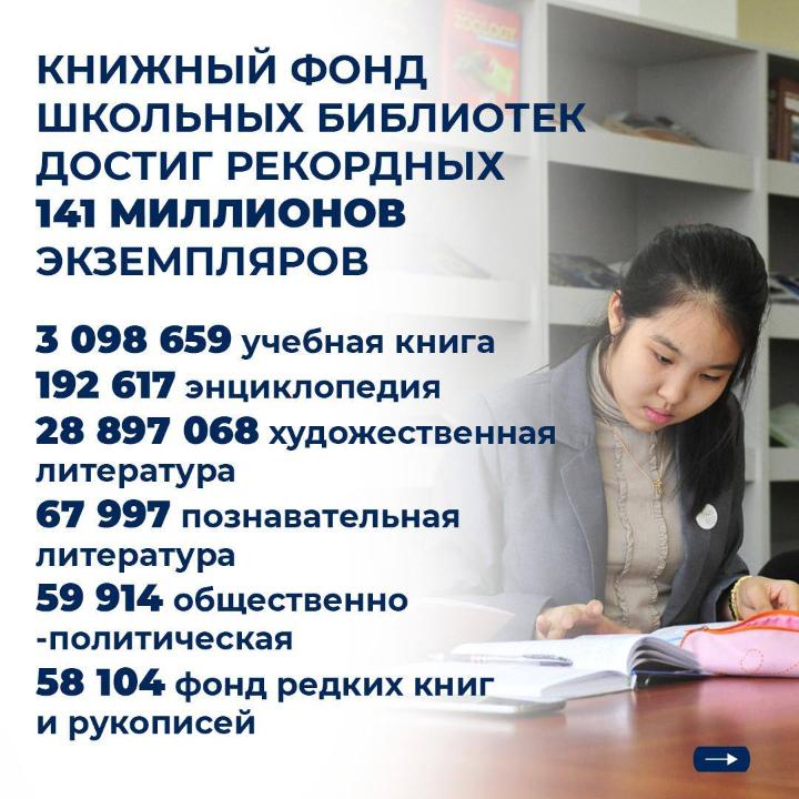 В рамках проекта ведется системная работа по обновлению школьных библиотек и развитию интереса к чтению среди учащихся. На сегодня фонд школьных библиотек пополнился 1,6 млн экземпляров художественной литературы, тем самым составив в общем числе более 141 млн книг, передает пресс-служба Министерства просвещения РК.