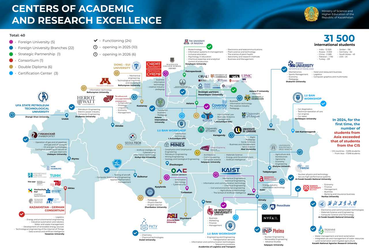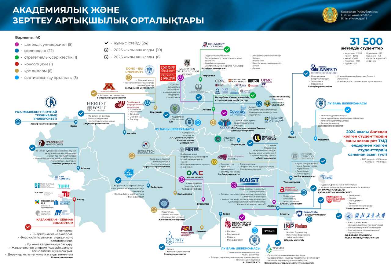 – Безусловно. Есть ещё одна мировая тенденция: привычные традиционные академические хабы, такие как Америка, Великобритания, Канада и другие, сейчас ограничивают въезд иностранных граждан в том числе и для получения высшего образования. Приведу только два примера. В этом академическом году 71% студентов, поступивших в Канаду, не получили визы. Из 350 тыс. студентов этой же страны, уже успешно поступивших в вузы Великобритании, визы получили только 4 тыс. Как видим, ситуации преломляется, акценты расставляются по-новому, многие страны понимают, что хотели бы занять свою прочную академическую нишу и стать новыми хабами, успешны в этом плане Китай, Малайзия, Сингапур и ряд других стран. И это большая конкурентная среда на международном уровне. Какой выход для нас? Мы тоже хотим и становимся образовательным хабом. При этом делаем ставку на качество зарубежных вузов-партнёров. Те вузы, которые заходят в Казахстан, как минимум входят в ТОП-250 мировых рейтингов. Мы не стали делать, как некоторые страны, режим «открытых дверей» для любого желающего вуза, мы стали приглашать для открытия филиалов только сильные университеты. И второе – создали чёткий, точный пакет поддержки этим вузам в нашей стране. За последние три года Казахстан привлёк 40 ведущих зарубежных университетов-партнёров, с которыми реализуются как совместные образовательные программы, так и исследовательские проекты. Ведётся строительство современных кампусов, внедряются международные стандарты преподавания, оценки и управления. При этом особое внимание уделяется приоритетным для экономики Казахстана направлениям. Вторым важным направлением является сокращение оттока казахстанских студентов. Министерством определены зарубежные стратегические партнёры для всех региональных университетов страны, благодаря чему у казахстанских абитуриентов появилась реальная возможность получить образование международного уровня в своей области, не выезжая за рубеж. Такая альтернатива обучению за границей особенно важна в условиях стоимости зарубежного образования. Это снижает финансовую нагрузку на семьи и государство и одновременно повышает привлекательность региональных вузов.