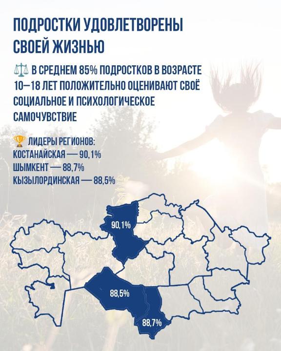 Не менее значимым показателем является удовлетворённость подростков жизнью: в среднем 85% детей в возрасте 10–18 лет положительно оценивают свое социальное и психологическое самочувствие. По данному направлению наивысшие значения зафиксированы в Костанайской области (90,1%), в г. Шымкент (88,7%) и Кызылординской области (88,5%).
