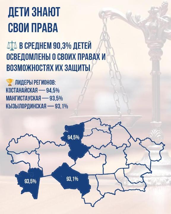 Согласно результатам, средний уровень правовой защищённости детей составил 90,3%, что свидетельствует о высокой степени осведомлённости о своих правах и наличии механизмов их защиты. Лидерами стали Костанайская (94,5%), Мангистауcкая (93,5%) и Кызылординская (93,1%) области.