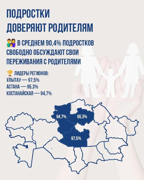 Особое внимание уделялось уровню доверия в семье. Исследование показало, что 90,4% подростков могут открыто обсуждать свои переживания с родителями. Наиболее высокие показатели отмечены в области Ұлытау (97,5%), г.Астана (95,3%) и Костанайской области (94,7%).