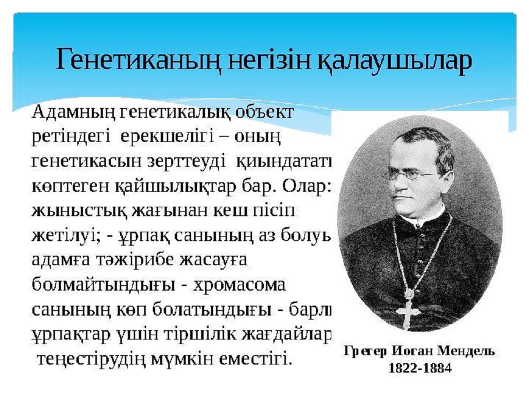 1865 жылы чех ғалымы Г.Мендельдің «Өсімдік будандарымен жүргізілген тәжірибелер» деген еңбегі жарық көрді. Ол сынақ тәжірибелері арқылы 14 тұқым қуалаушылықтың негізгі заңдылықтарын қалыптастыру арқылы генетиканың негізін қалады. Бірақ оның бұл ғылыми тұжырымы ұзақ уақыт бойы көптеген биолог мамандарға белгісіз күйінде қалып, отыз бес жылдан соң ғана әріптестерінен лайықты түрде тиісті бағасын алыпты.