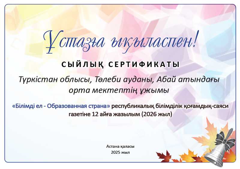 Осы мектептің түлегі ретінде, мереке қарсаңында өз атымнан Сіздерге рухани сый ретінде «Білімді ел» республикалық газетіне жазылуды тарту етуді жөн көрдім. Бұл басылымнан заманауи білім беру үрдістері мен педагогикалық тәжірибелер туралы мол мағлұмат алып, ұстаздық еңбектеріңізге жаңа серпін беретініне сенемін.