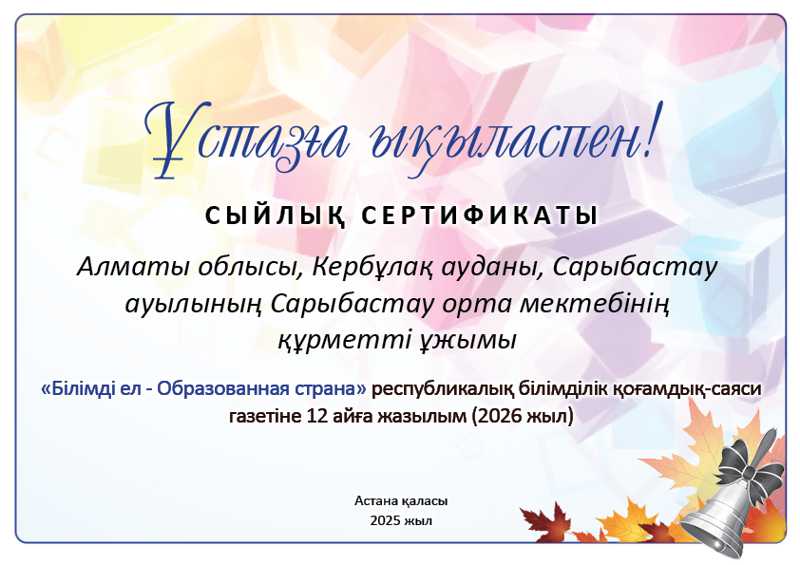 Осы мектептің түлегі ретінде, сіздердің еңбектеріңізге деген ризашылығымның белгісі ретінде, рухани сый ретінде «Білімді ел» республикалық басылымына жазылу тарту етуді жөн көрдім. Бұл газеттен сіздер заманауи білім беру үрдістері мен озық педагогикалық тәжірибелер жайлы мол мағлұмат алып, кәсіби дамуларыңызға серпін аласыздар деп сенемін.