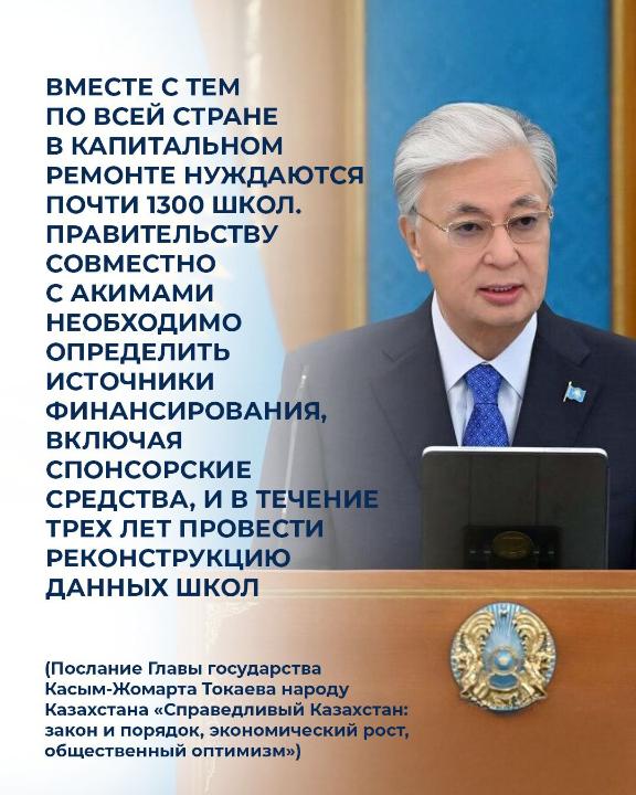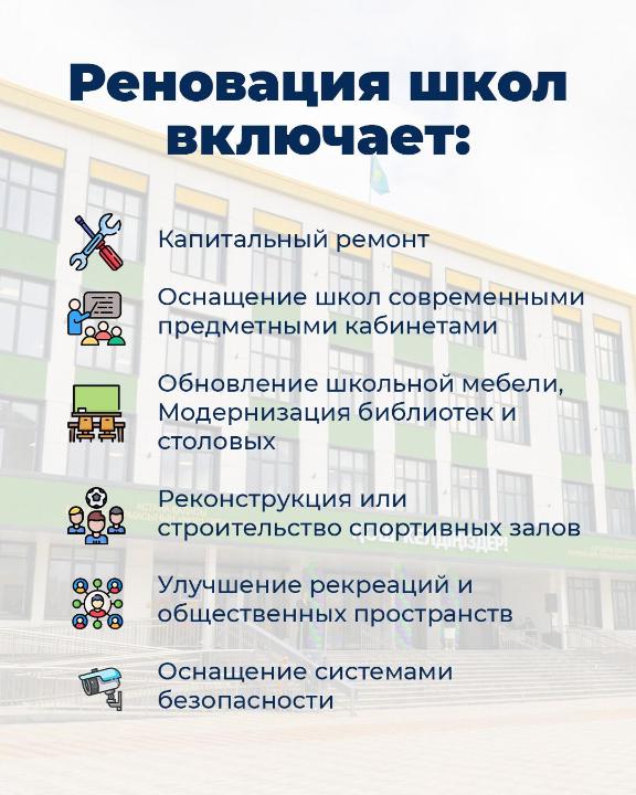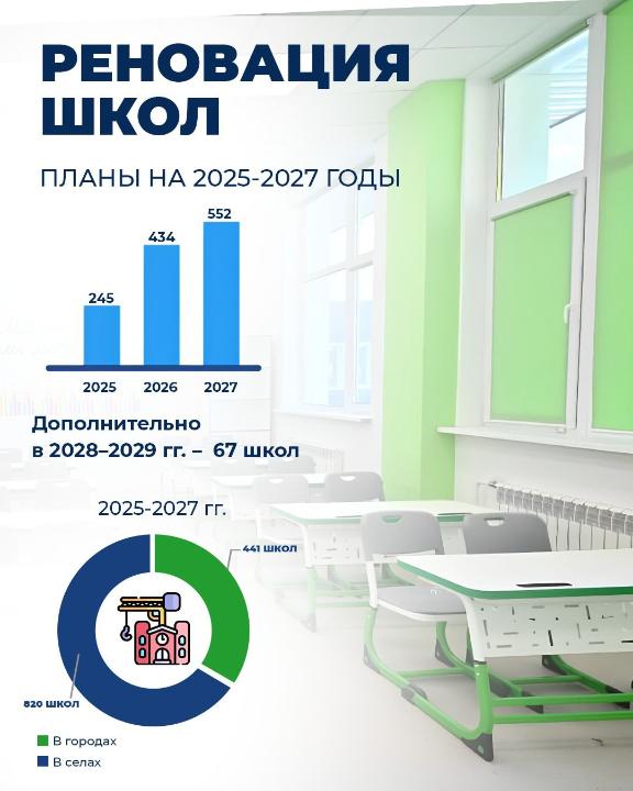 По поручению Главы государства для перехода к единому современному формату школьной инфраструктуры стартовала программа реновации около 1300 школ до 2029 года