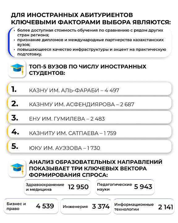 Рост числа иностранных обучающихся на 11% по сравнению с 2024 годом является прямым индикатором того, что Казахстан входит в фазу формирования полноценного образовательного центра, предоставляющего качественные образовательные программы, международную академическую среду и широкие возможности для дальнейшей профессиональной карьеры.