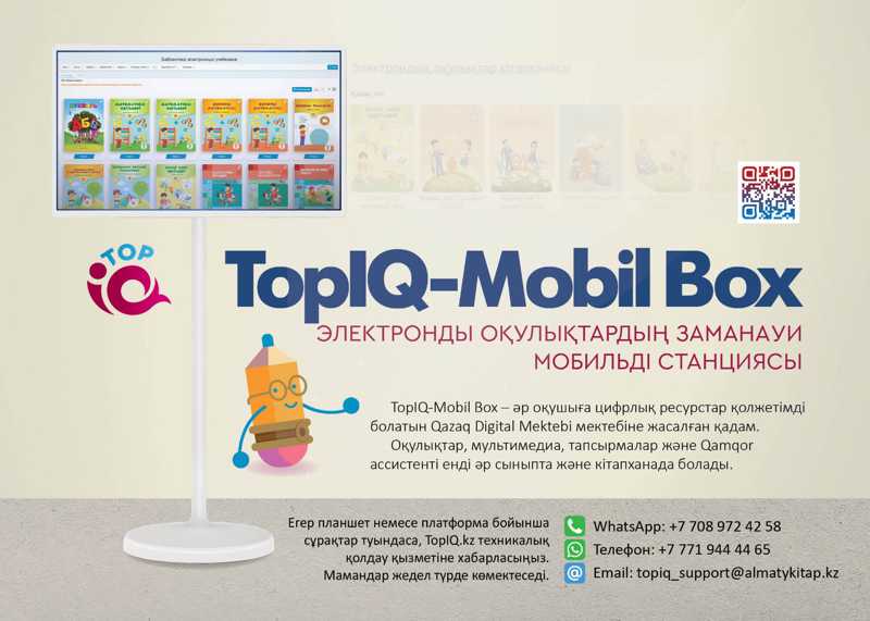 Сонымен қатар «Qamqor» күнтізбелік-тақырыптық жоспарлауды оңтайландырып, оқу материалдарын талдап, мұғалімдерге қажетті ақпаратты тез табуға көмектеседі. Бұл құрал ұстаздардың уақытын үнемдеп, білім сапасын арттыруға ықпал етеді. Мобильді оқу станциялары – TopIQ-Mobil Box. Шэньчжэнь қаласының КТС компаниясымен бірлесіп жасалған TopIQ-Mobil Box – ауылдық, қалалық және балалар кітапханаларына арналған «Алматыкітап» баспасының жаңа өнімі.