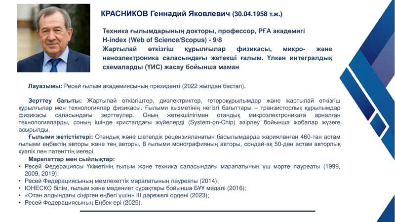 КРАСНИКОВ Геннадий Яковлевич – техника ғылымдарының докторы, профессор, Ресей ғылым академиясының президенті. Жартылай өткізгіш құрылғылар физикасы, микро және наноэлектроника саласының жетекші ғалымы. Аса үлкен интегралдық схемаларды жасау саласының маманы.