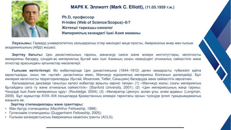 ЭЛЛИОТТ Марк Кристофер (Mark C. Elliott) – Ph.D, профессор, Гарвард университетінің вице-провосты (АҚШ). Жетекші синолог-ғалым, Қытай мен Еуразия тарихы мен саясаты саласының маманы. Империялық кезеңдегі Ішкі Азия бойынша маман.