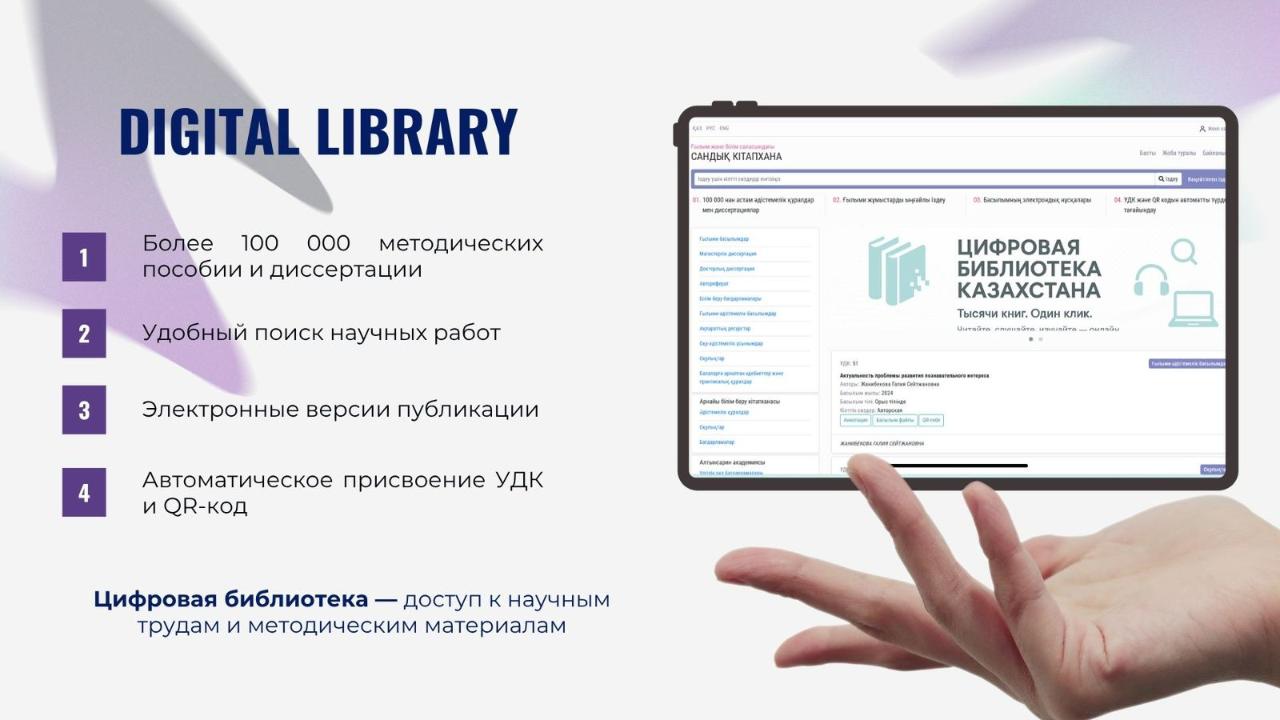 Республиканская научно-педагогическая библиотека Министерства просвещения РК разрабатывает и внедряет ряд современных информационных систем в целях модернизации библиотечной деятельности организаций образования, развития читательской культуры и расширения доступа к информации, передает пресс-служба Министерства просвещения РК.