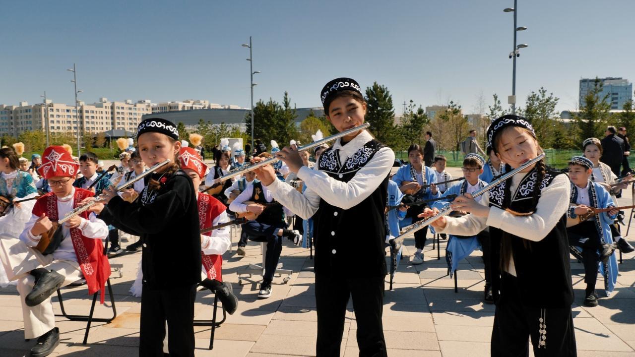 Школьники играли на национальных и классических инструментах, таких как домбра, кобыз, кыл-кобыз, жетыген, сазсырнай, флейта и скрипка.